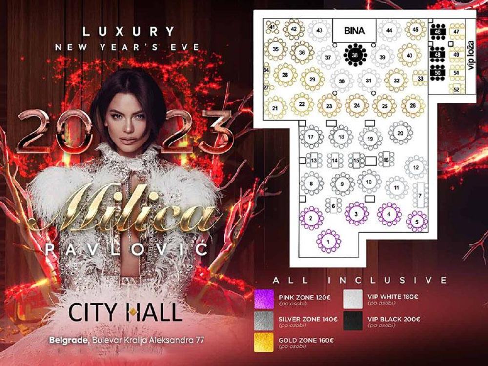 Cene ulaznica, koje se kreću od 150 do 350 evra, uključuju svečanu večeru i čašu Moet šampanjca na samom ulazu, čime se naglašava ekskluzivitet ovog događaja. Sa četiri zone — plavom, bronzanom, srebrnom i zlatnom — svako će pronaći savršeno mesto za uživanje u Milicinim poznatim numerama, poput 'Boginja', 'Sexy Senorita' i mnogih drugih.