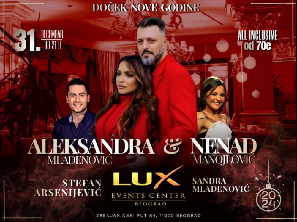 Nenad Manojlović Doček Nove godine 2024 u Lux Event Centru je idealna prilika da uđete u novu godinu uz vrhunsku zabavu, prefinjenu uslugu i nezaboravnu atmosferu u srcu Beograda.