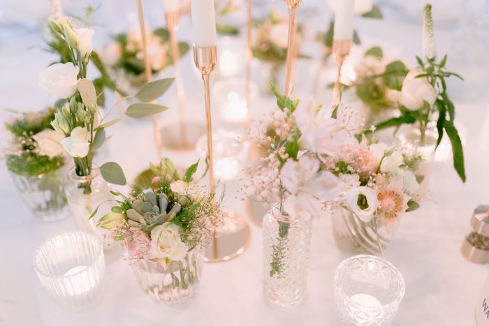 Paleta boja takođe igra važnu ulogu u stvaranju elegantne atmosfere. Neutralne boje kao što su bela, krem, šampanjac ili siva često se koriste kako bi se postigla sofisticirana estetika. Kada se ove boje uklope sa odabranom profesionalnom dekoracijom i detaljim kao što su: cvetni aranžmani, stolnjaci, stolice ili dekorativni elementi, postiže se fantastičan estetski efekat.