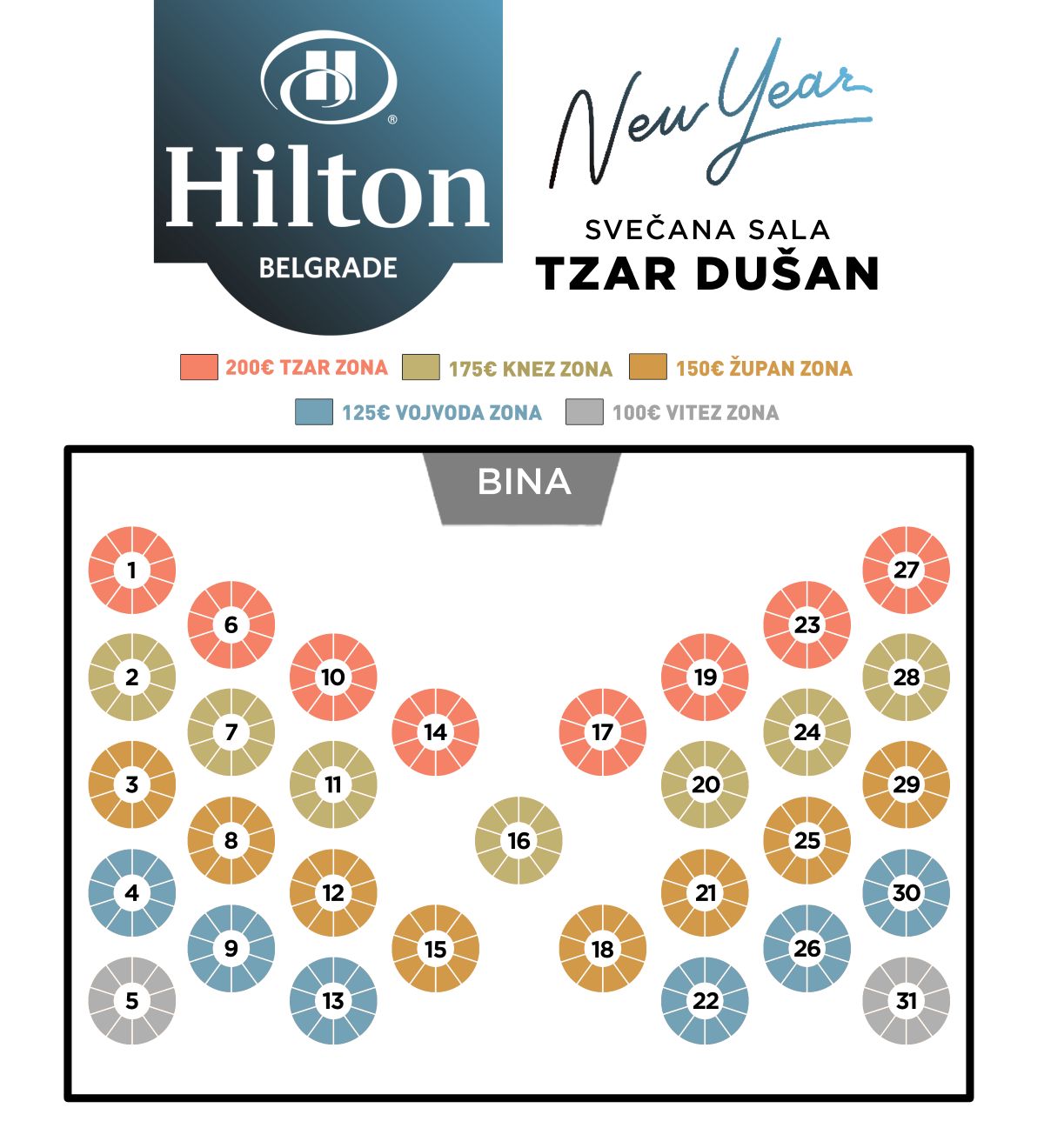Hotel Hilton Beograd doček Nove godine 2027 je idealan izbor za sve koji teže prestižnoj ekskluzivnosti i žele dočekati Novu godinu u društvu odabranih. Impresivna banket sala Tsar Dušan, površine 407m2, ugostiće oko 350 gostiju i ostaviće vas bez daha svojim sofisticiranim dizajnom, luksuznim enterijerom i prelepom dekoracijom.