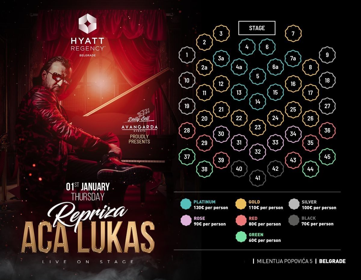 Kada je repriza dočeka Nove godine 2026 u pitanju, Hotel Hyatt priprema spektakularan provod za koji će biti zadužen neprikosnoveni Aca Lukas! Besprekorna usluga i savršena atmosfera učiniće da Hotel Hyatt zajedno sa vama zaigra u vrelom ritmu najvećih hitova. Biće to spektakl o kome će se dugo pričati.