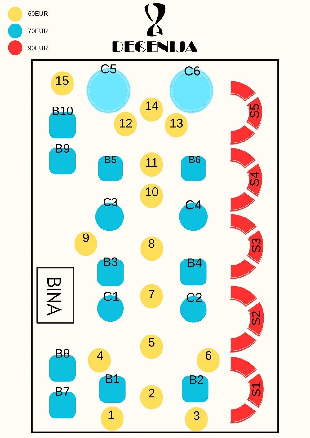 Cena po osobi se kreće od 60€ do 90€ u zavisnosti od pozicije stola u samoj sali (videti na mapi sedenja ispod) i uključuje elegantno mesto za sedenje, svečanu večeru na bazi švedskog stola i all inclusive ponudu pića tokom cele večeri.