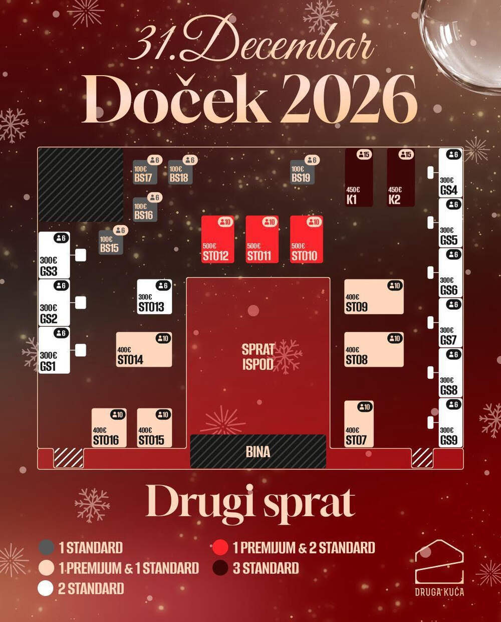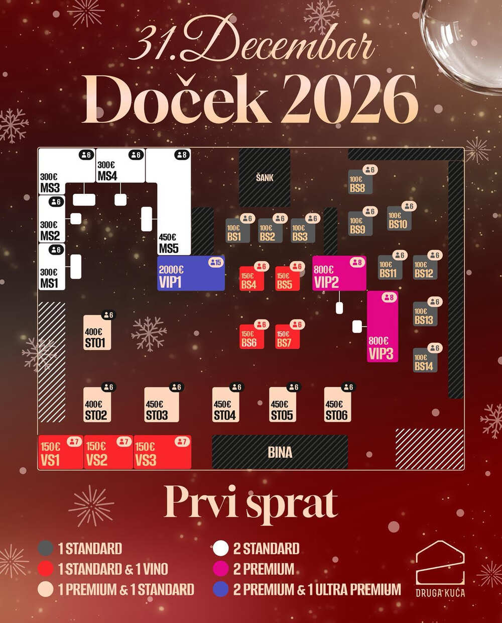 Pozovite svoje prijatelje i proslavite Doček Nove godine 2026 u Drugoj Kući sa stilom i u isključivo dobrom raspoloženju.