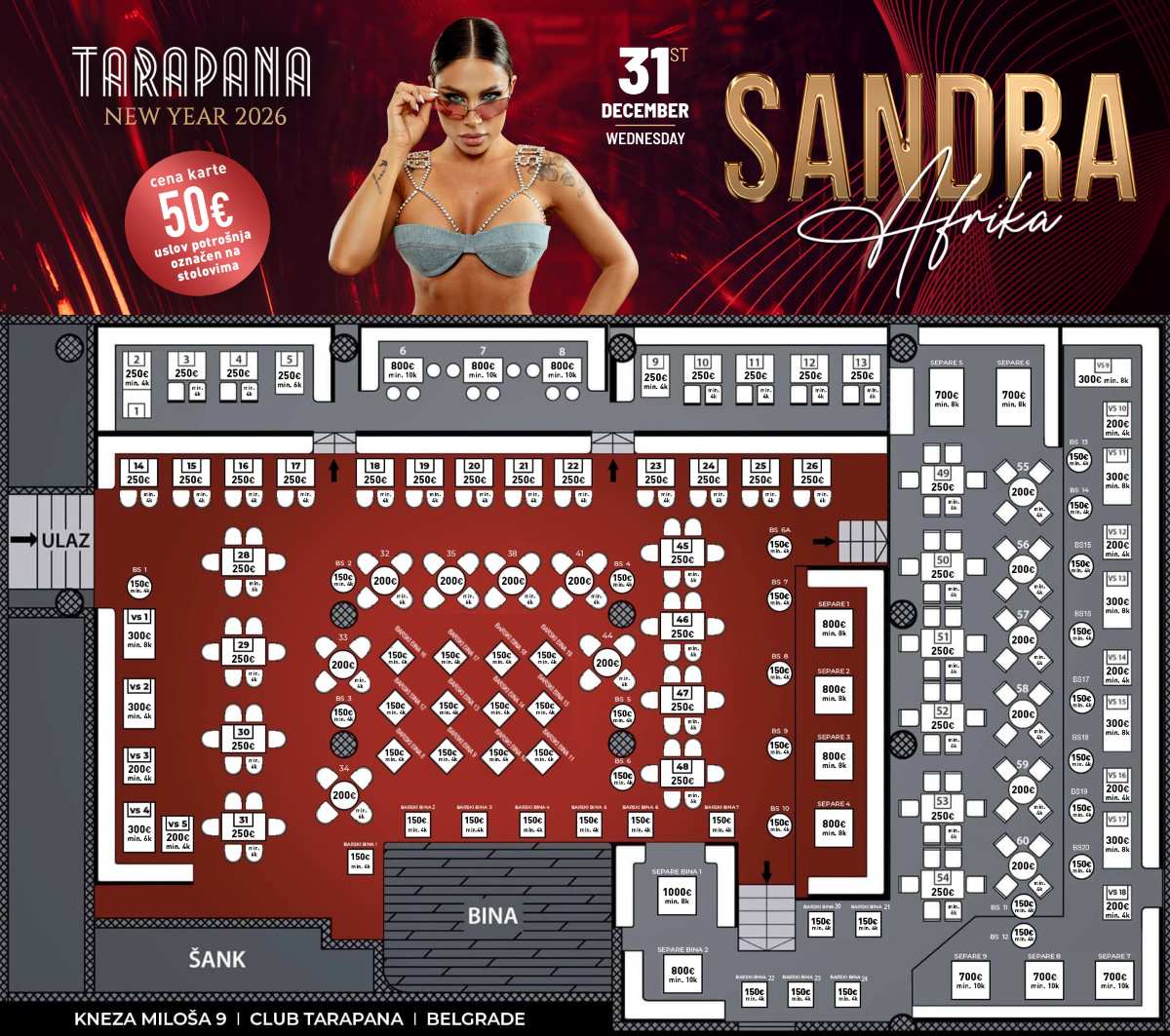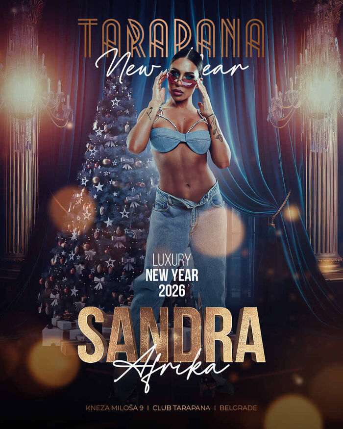 Za doček Nove godine 2026 klub kafana Tarapana je pripremila popularnu ponudu i vrhunski muzički program sa velikom i harizmatičnom muzičkom zvezdom - Sandrom Afrikom!