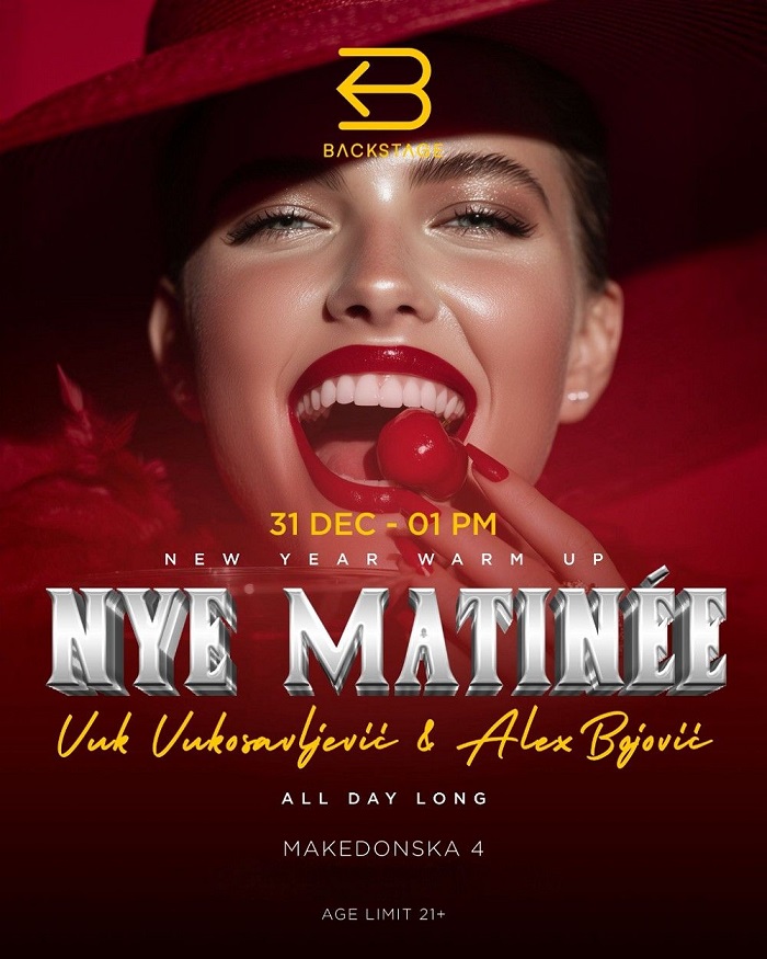 Backstage bar Matinee doček Nove godine 2026 je prilika da se na pravi način zagrejete za noćni provod! Za to će se pobrinuti tim koji vam nudi premijum iskustvo, a vaš jedini zadatak je da da uživate, plešete i konzumirate najbolja pića!
