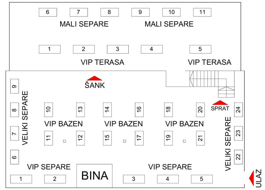 - VIP bazen 500 eur - dobija se gratis 7 flaše stranog žestokog pića po izboru, 20 energetskih pića, 2 flaše vina i 2 flaše domaćeg šampanjca