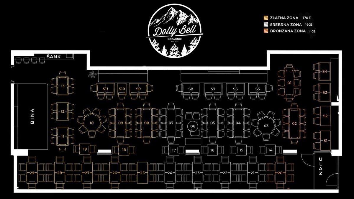 Cena po osobi se kreće od 140€ do 170€ u zavisnosti od pozicije stola u samoj sali i uključuje svečanu večeru (videti na mapi sedenja ispod):