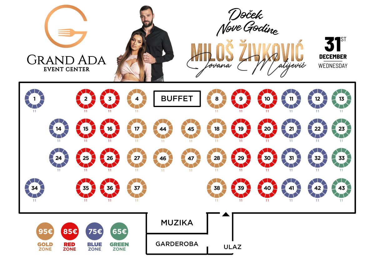 *Napomena: Orijentaciona mapa prostora. U skladu sa novogodišnjom postavkom sale, moguća su manja odstupanja u rasporedu stolova.