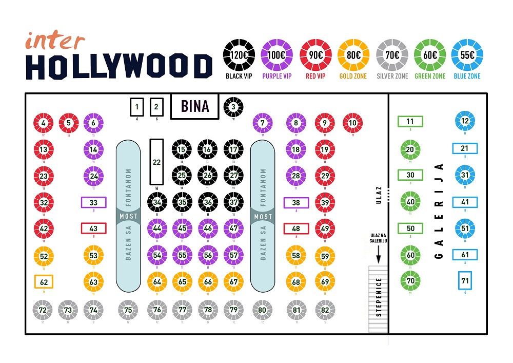 Cena po osobi se kreće od 55€ do 120€ u zavisnosti od pozicije stola u samoj sali i uključuje elegantno mesto za sedenje, kompletnu večeru i neograničenu konzumaciju pića tokom cele večeri (vidi na mapi).