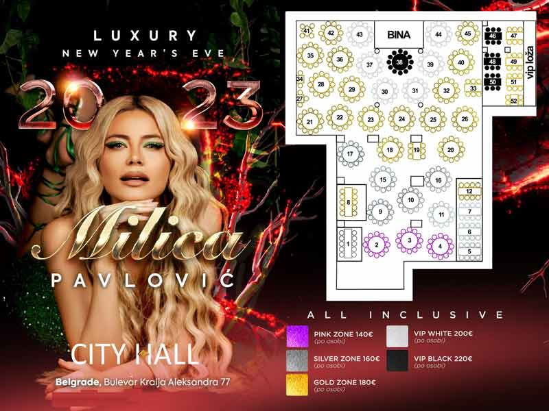 Cena po osobi se kreće od 65€ do 120€ u zavisnosti od pozicije stola u samoj sali (videti na mapi) i uključuje elegantno mesto za sedenje, svečanu večeru na bazi švedskog stola i all inclusive ponudu pića tokom cele večeri.