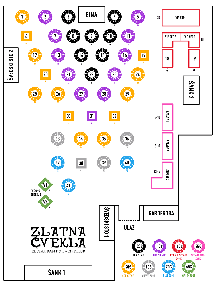 *Napomena: Orijentaciona mapa prostora. U skladu sa novogodišnjom postavkom sale, moguća su manja odstupanja u rasporedu stolova.