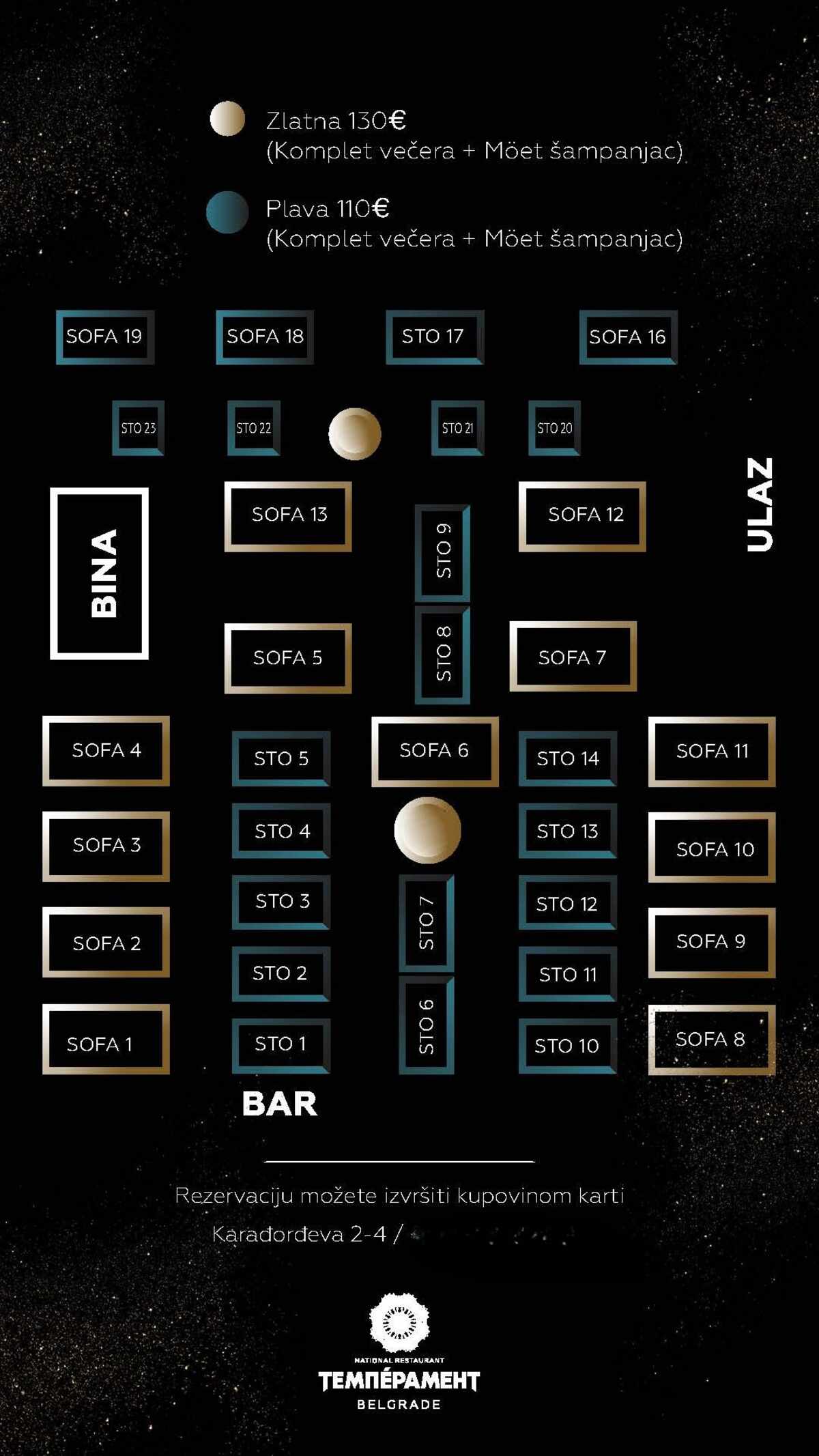 Cena karte po osobi kreće se od 110€ do 130€, u zavisnosti od pozicije stola u samoj sali (pogledatii mapu) i obuhvata komplet večeru + 1 piće dobrodošlice - čašu Möet šampanjca.